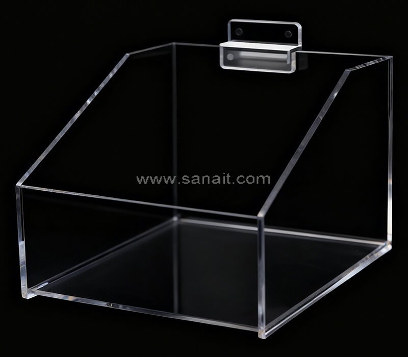 3. Design: Open-front, rectangular bin with angled side walls for easy access and product visibility.